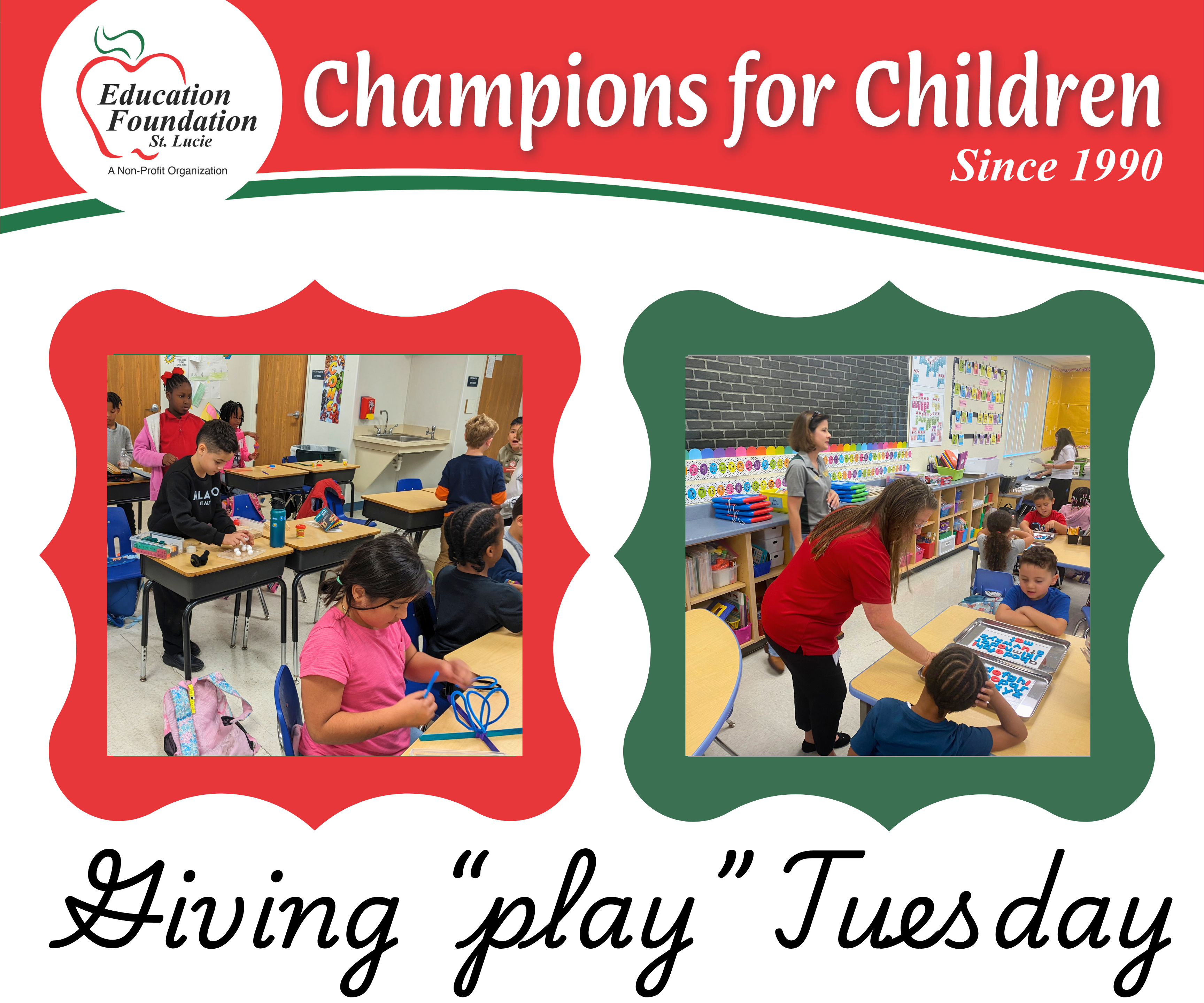 Happy 'Giving Tuesday' season to all! Did you know that each of our Kindergarten classrooms in St. Lucie Public Schools has been furnished with a "Play with Purpose" kit? That's all thanks to you and your dedication to public education where you live and work. This 'Giving Tuesday', we are revamping the holiday into 'Giving "Play" Tuesday' and offering you the opportunity to donate to our "Play with Purpose" update program. These kits get a lot of play! They are always in need of refreshing, and we need your help to do it. Your gift of $25, $50, $100 or $1,000 this 'Giving Tuesday' season will be used directly for revamping our "Play with Purpose" kits. These kits - featuring make believe, imagination buidling themes like restaurant, grocery store, marine scientist, veterinary clinic and more - will be re-supplied with up to date, new items for our Kindergarten students to learn and grow with. All while enjoying the gift of play during their school day. Play has been proven to foster social and emotional development through conflict resolution. It's also a key contributor to early literacy skills, while teaching empathy and cooperation. Your gift this 'Giving "Play" Tuesday' will go directly to "Play with Purpose". Help us reach our goal of $10,000. Give Play Today!